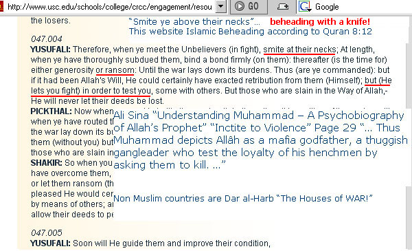 "… When you encounter those [infidels] who deny [the Truth=Islam, i.e. "(in fight)" 9:29 "Fight those who believe not in Allah"] then strike [their] necks' (Qur'an sura 47, verse 4)" ;non-Muslim countries are Dar al-Harb [al-Kufr, unbelieve], the domains of WAR